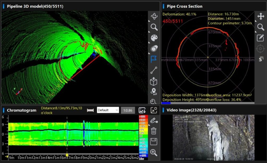 Analisa e extrai automaticamente as imagens já que conta com um sistema integrado de vídeo inspeção, LIDAR e sonar, que permite de forma imediata ter informações sobre o contorno interno da parede, estabelecer um modelo tridimensional e realizar a análise quantitativa de sedimentos.